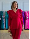 Conjunto de fiesta de pantalón recto y blazer cuello pico, volante en costados y hombro, y abotonadura forrada.