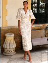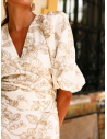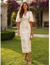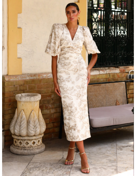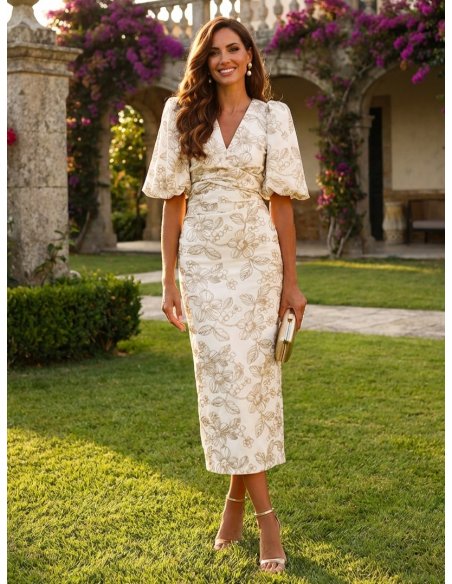 Tejido Joya (Bordado): La base del éxito de este diseño es su tela. Sobre un fondo crema/marfil se despliega un bordado floral en hilos tostados. No es un estampado plano, es pura textura y relieve que capta la luz de forma preciosa, aportando un aire de alta costura.