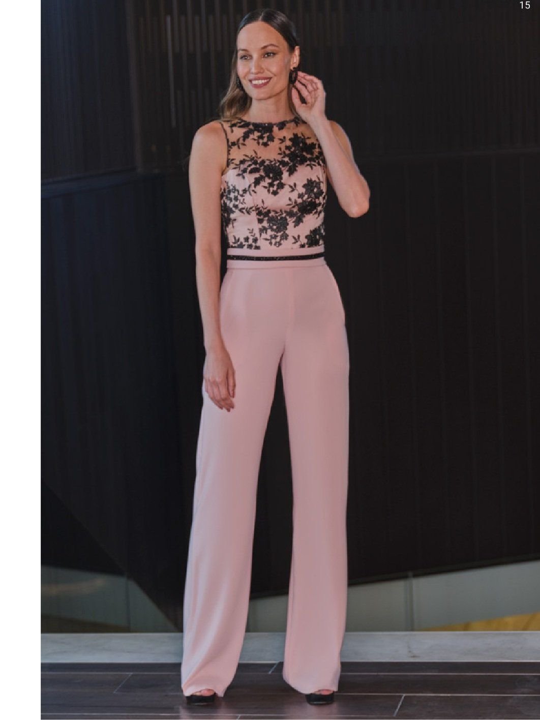 El modelo Judit es especialmente femenino y coqueto, pues además de su ancho pantalón palazzo con bolsillos internos y cinturilla con cinturón de fajín, super confortable, presenta un cuerpo de ensueño, de encaje, blonda y pailletes , donde las semitransparencias maridan con su cuerpo interior de escote palabra de honor y tono a contraste, de escote cerrado en el frente, y espalda semi descubierta.