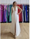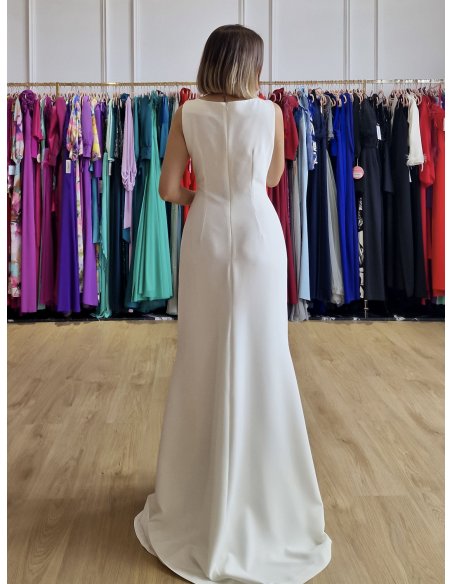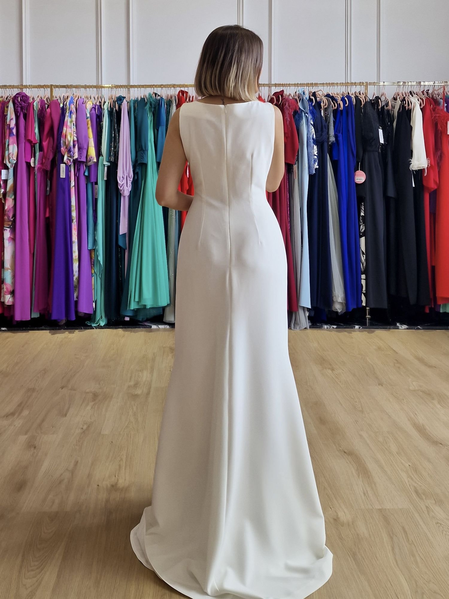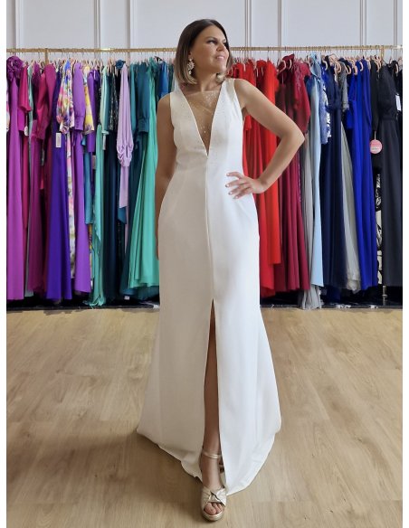 Podrás lucir pierna y taconazo gracias a su abertura frontal, e insinuante con su escote en pico profundo cerrado con tul en tono piel para evitar situaciones incómodas. Este tul, y el resto de bordes del escote va salpicado de strass de diferentes tamaños, lo que te iluminará y te mostrará más radiante que nunca.