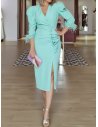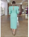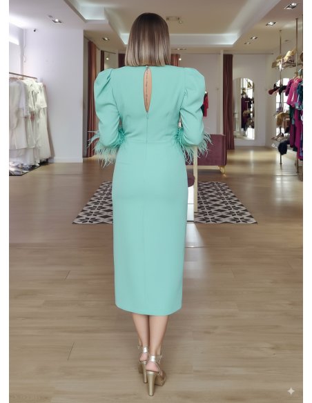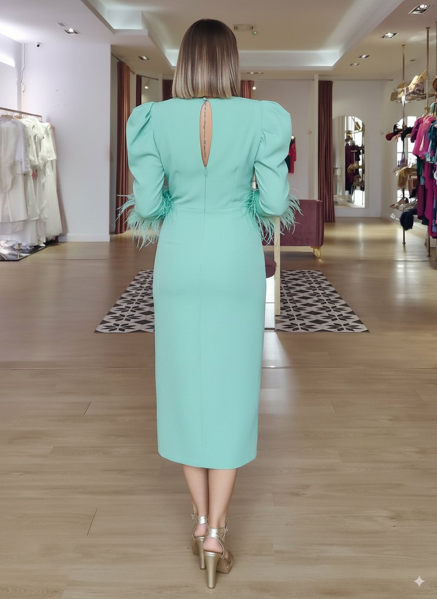 Su cuerpo es igualmente delicioso, pues a su manga francesa ligeramente abullonada con plumas en el puño, se suman el favorecedor y envolvente escote cruzado en pico, y la espalda con cierre lágrima.