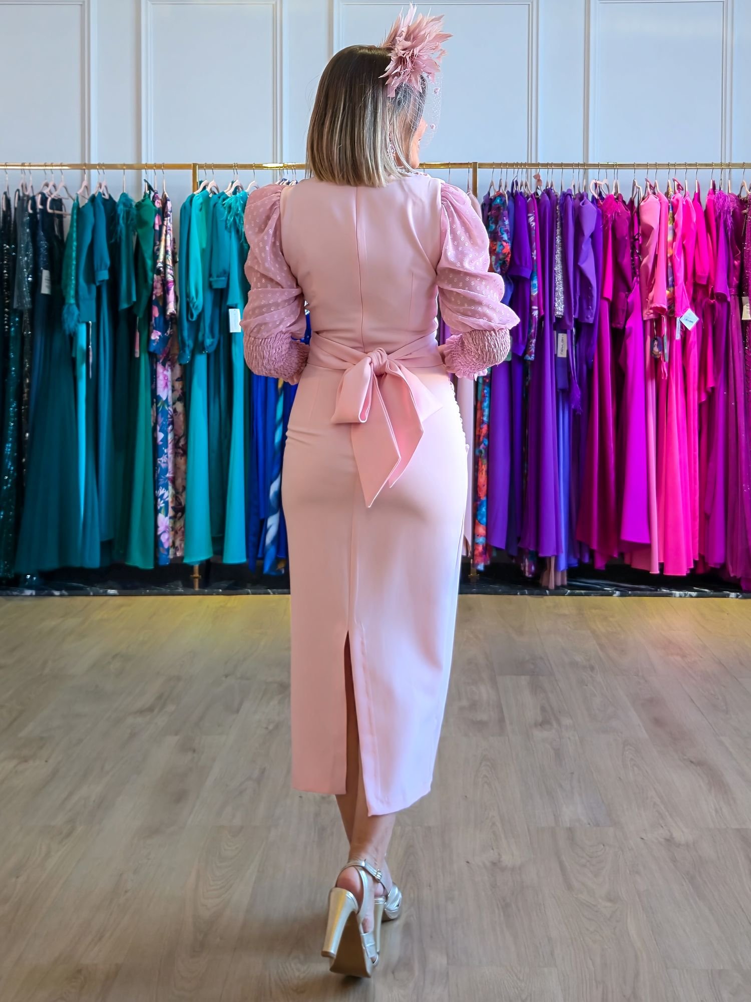 Vestido de fiesta corto o vestido de cóctel. Falda recta midi, cintura con lazo, y cuello caja plisado en un hombro. Mangas de plumeti a tono con puños de nido de abeja.