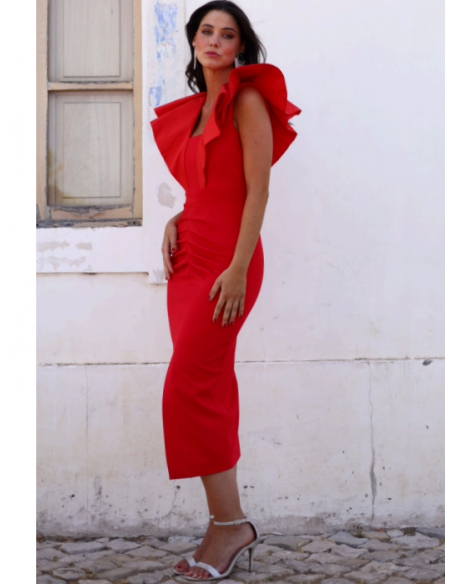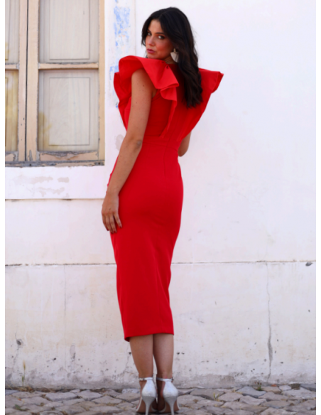 Boda de Día o Tarde: El rojo es el color de la fiesta por excelencia. Es apropiado tanto para bodas de mañana (por el corte midi) como de tarde (por la sofisticación del color).