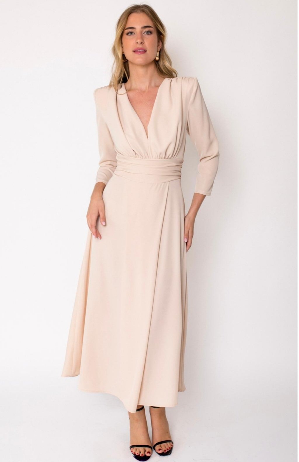 Para Boda de Día (Toque de Color): Este tono arena es el lienzo en blanco definitivo. Añade unos zapatos y un bolso en buganvilla, esmeralda, ocre o rojo oscuro para un contraste vibrante e impactante.