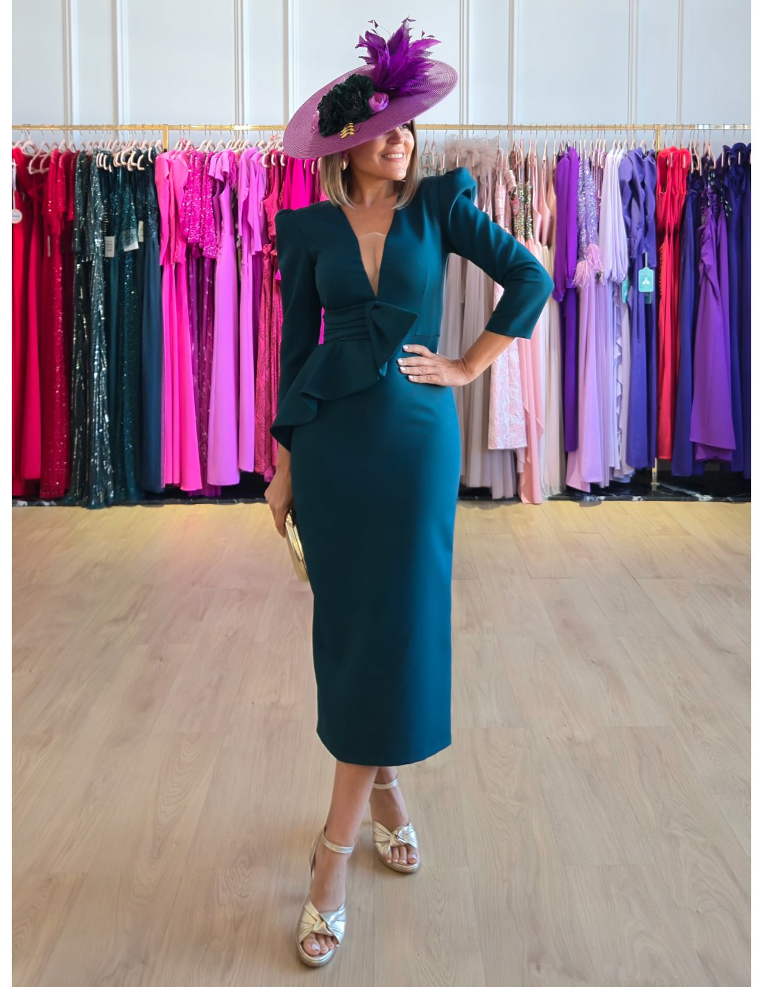Este vestido midi destaca por su silueta estructurada, que moldea y realza la figura sin sacrificar comodidad. El detalle que lo hace verdaderamente especial es el efecto peplum en una sola cadera, que nace de una cinturilla plisada que define y estiliza el talle de forma muy femenina. Un corte favorecedor y distinto, que resalta con sutileza.