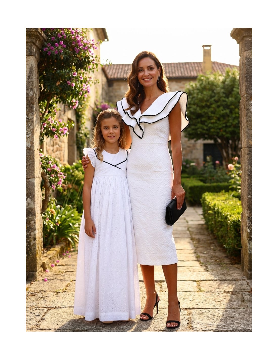 Mamá de Comunión: Es elegante, moderno y muy favorecedor. El blanco con negro es una combinación que nunca falla y transmite autoridad y estilo.