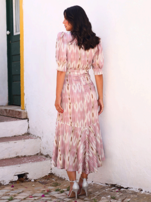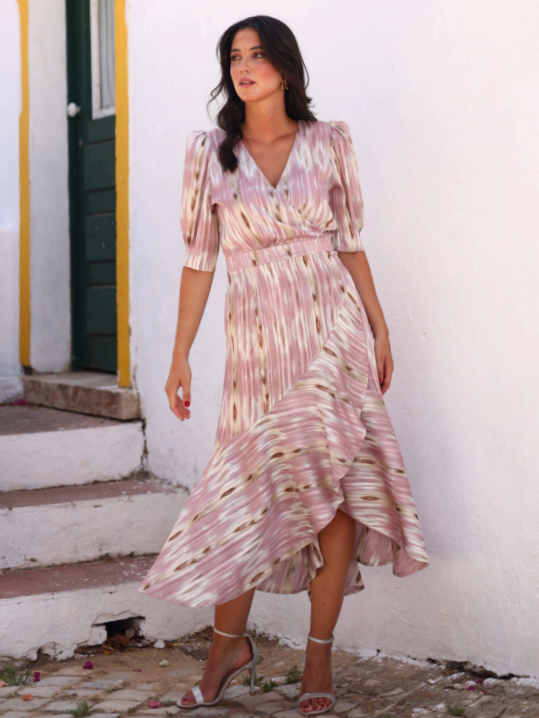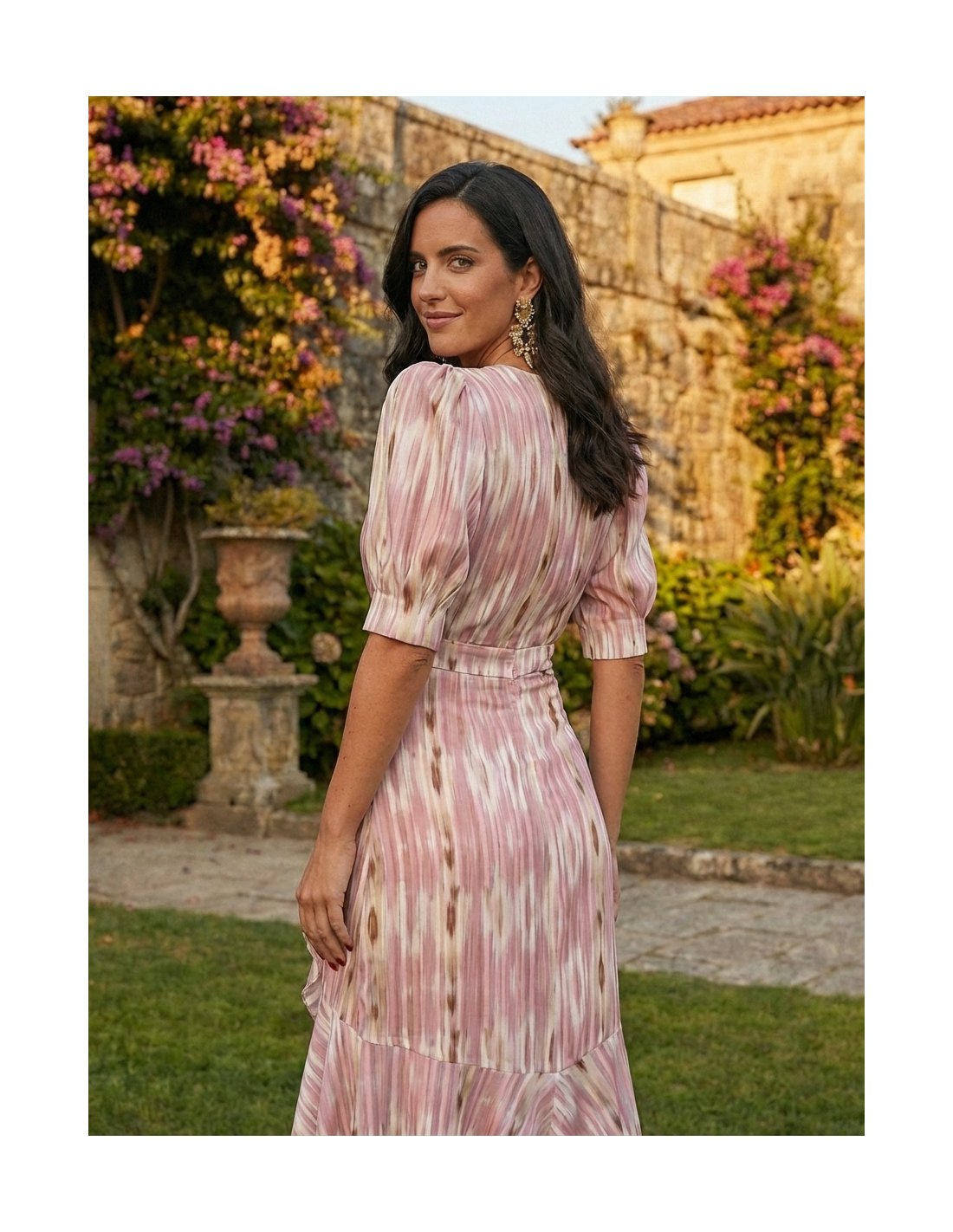 El Vestido OTÚN es la elección perfecta para la invitada que busca un look femenino, dulce y lleno de luz. Su tejido satinado con un estampado abstracto (tipo pinceladas o efecto Ikat) en una gama de rosas empovados y malvas lo convierte en una pieza muy especial para eventos de primavera y verano.