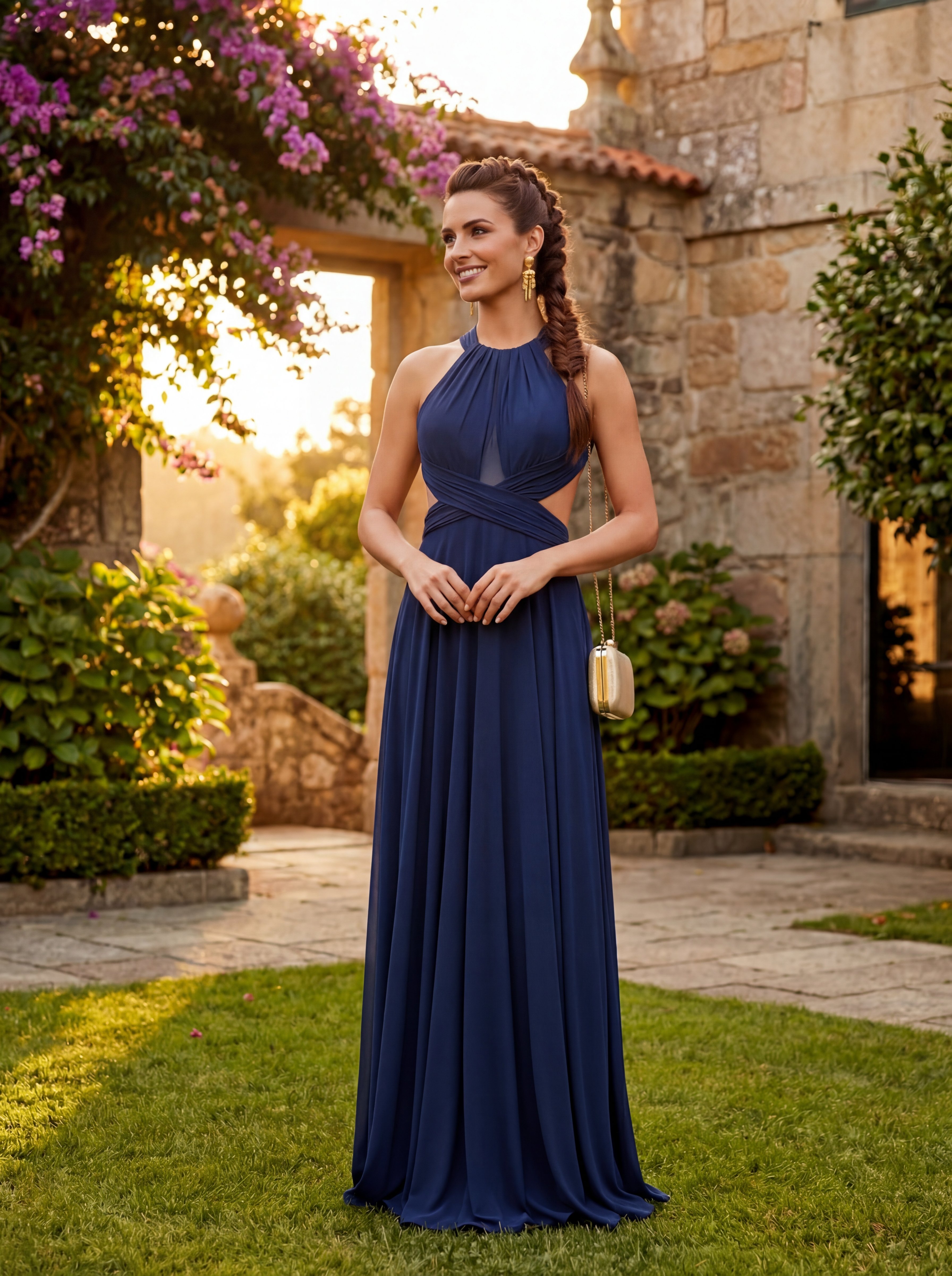 Escote Escultural: Su diseño presenta un cuello halter que despeja los hombros y estiliza el porte, aportando una distinción inmediata.
