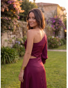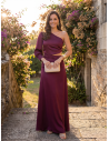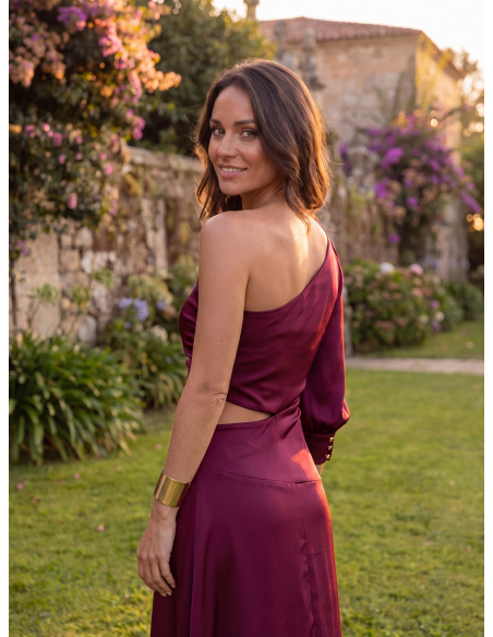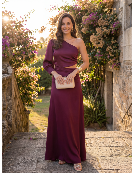 Es el vestido para la invitada que quiere ser recordada sin necesidad de recurrir a los brillos ni a los volúmenes excesivos. La sofisticación aquí tiene otro lenguaje: el de las líneas limpias, los cortes estratégicos y un tejido que habla por sí solo.