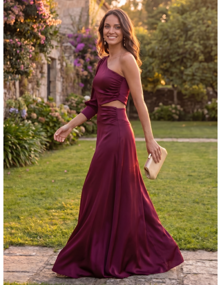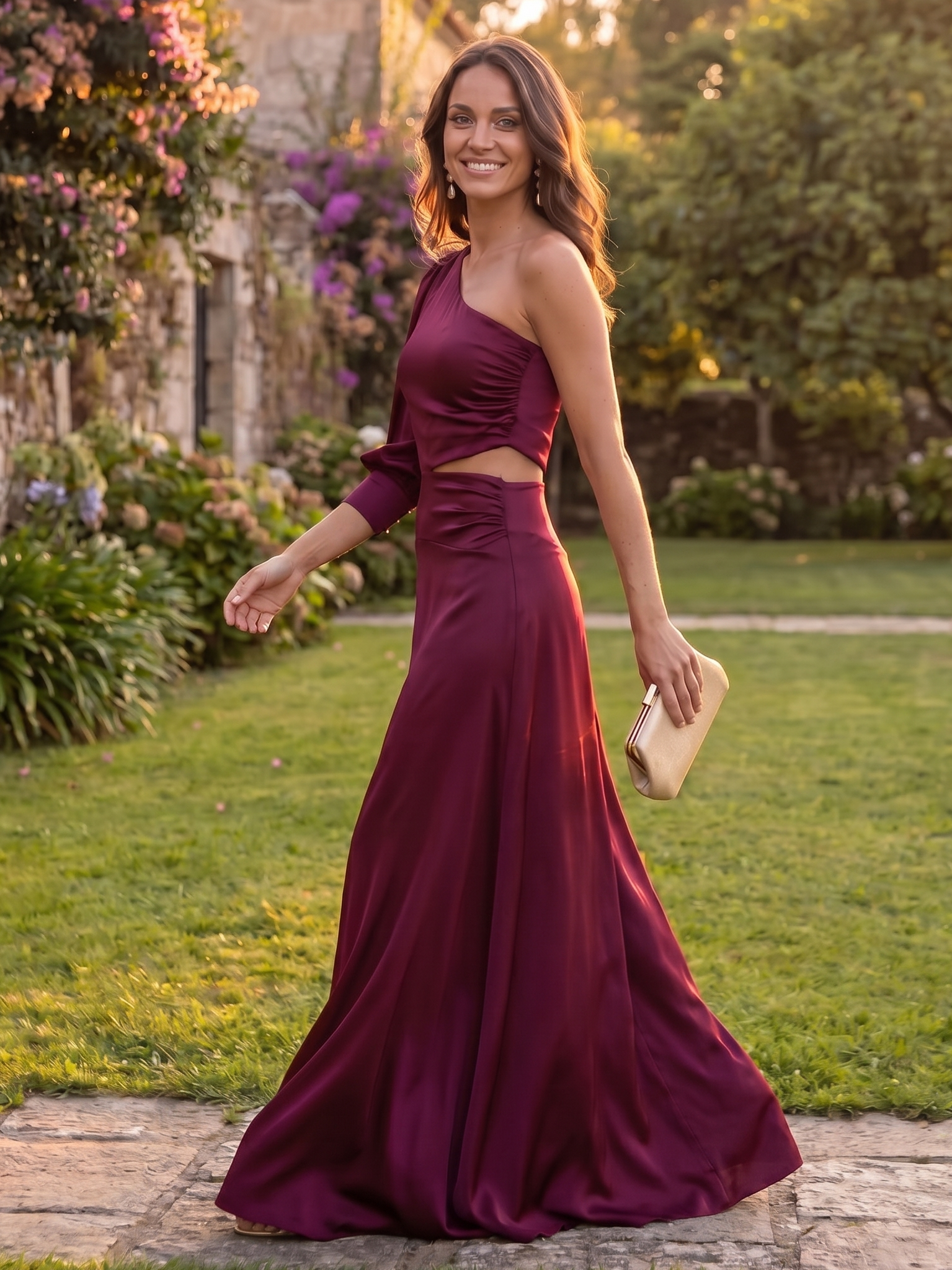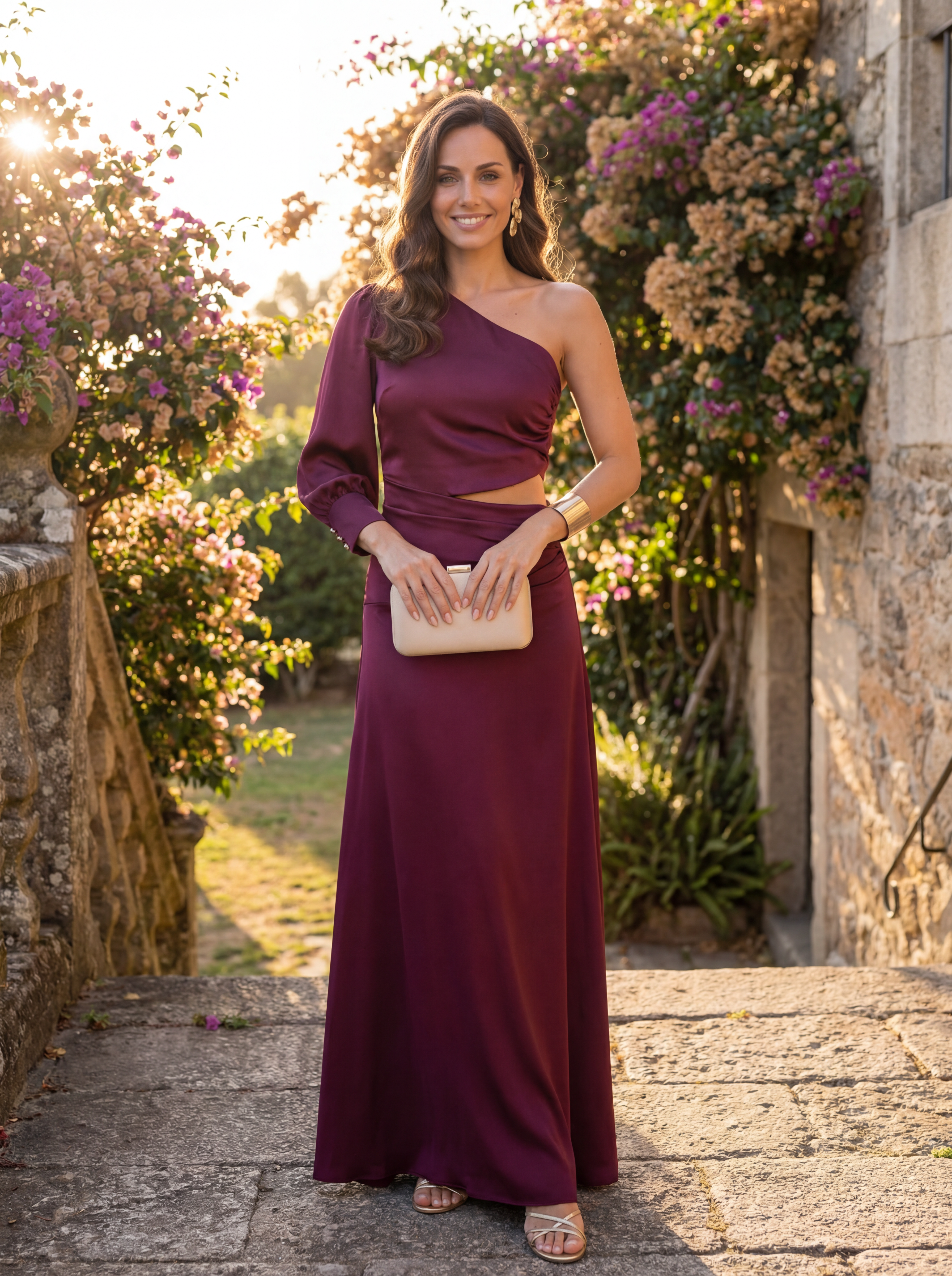 - Peinado: La asimetría del escote exige que el cabello colabore. Un recogido pulido — coleta alta, moño bajo o trenza lateral — despeja el hombro libre y permite que la geometría del vestido se aprecie en su totalidad. Las melenas sueltas funcionan si se llevan completamente hacia el lado de la manga.