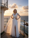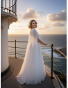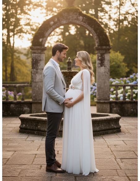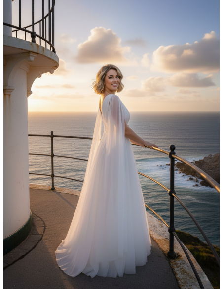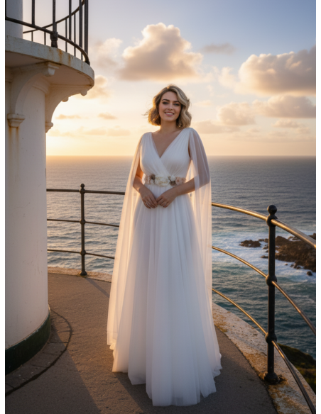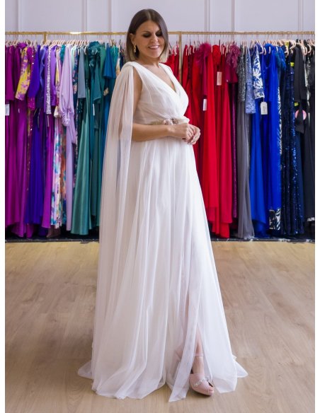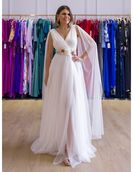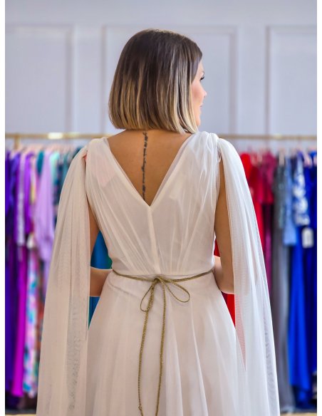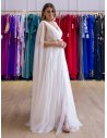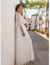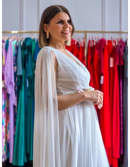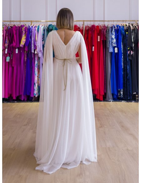 Completan este bello diseño, dos apliques del mismo tejido pero sin forrar, desmontables a través de unos sencillos corchetes interiores, que parten del hombro y caen a modo de manga capa.