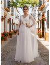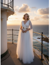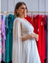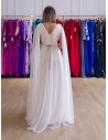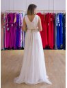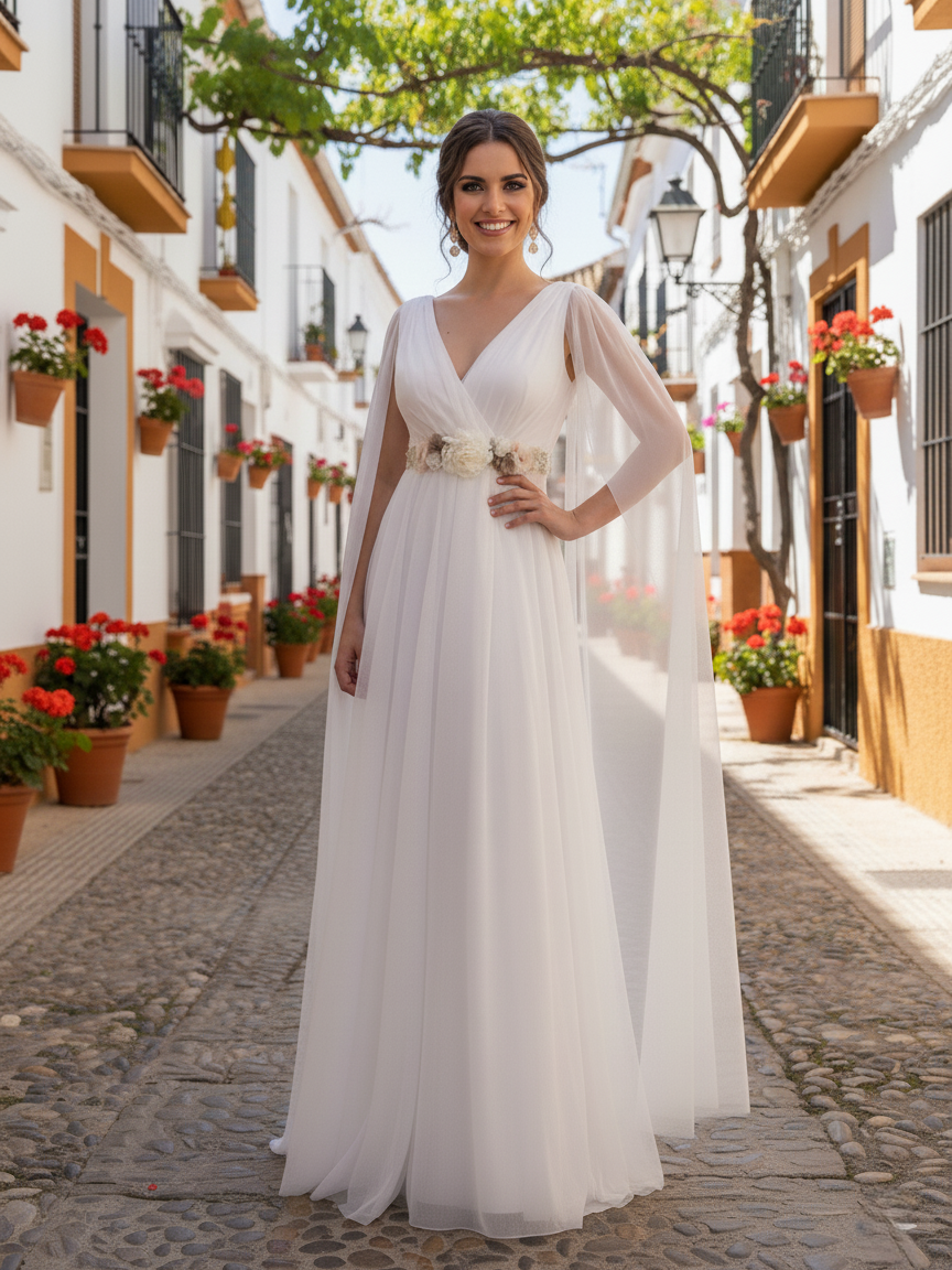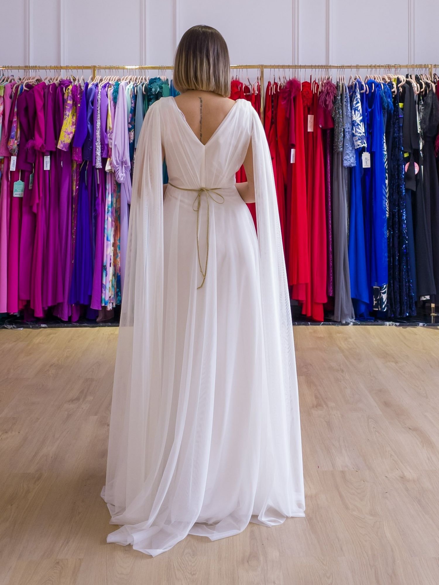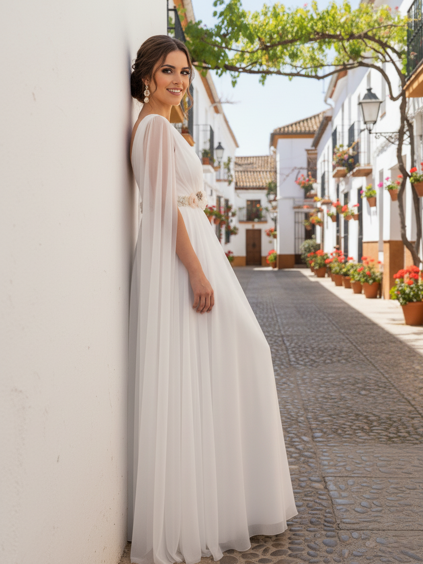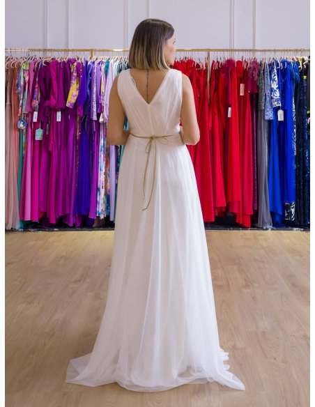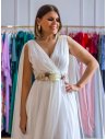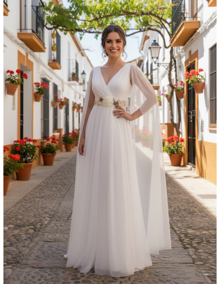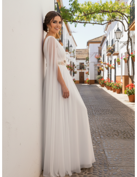 Vestido de novia largo, de línea helénica, que te hará lucir regia en el día de tu boda, sin que pierdas personalidad ni confort, pues su línea sencilla posee detalles favorecedores, sorprendentes y camaleónicos.