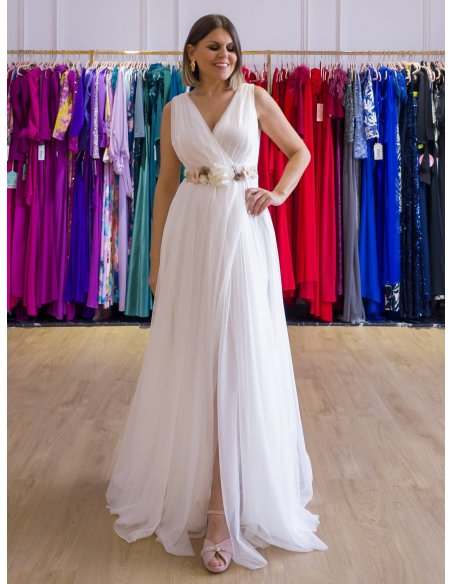 Corte en cintura para estilizarte, donde incluye un romántico cinturón floral de lazo, y que da paso a su cuerpo, de envolvente escote plisado y cruzado en pico, ideal sea cual sea tu talla de pecho.