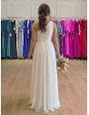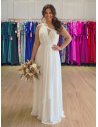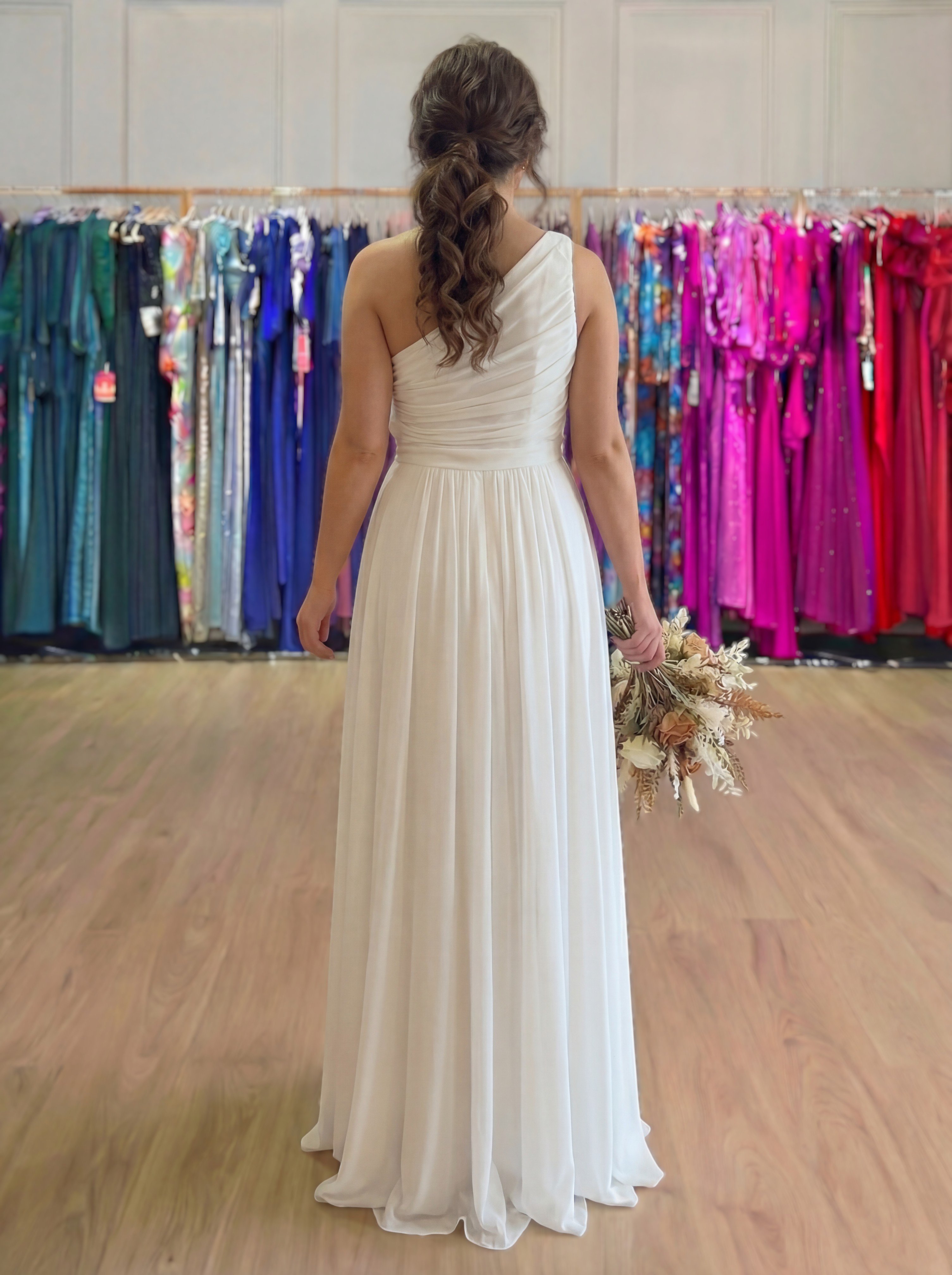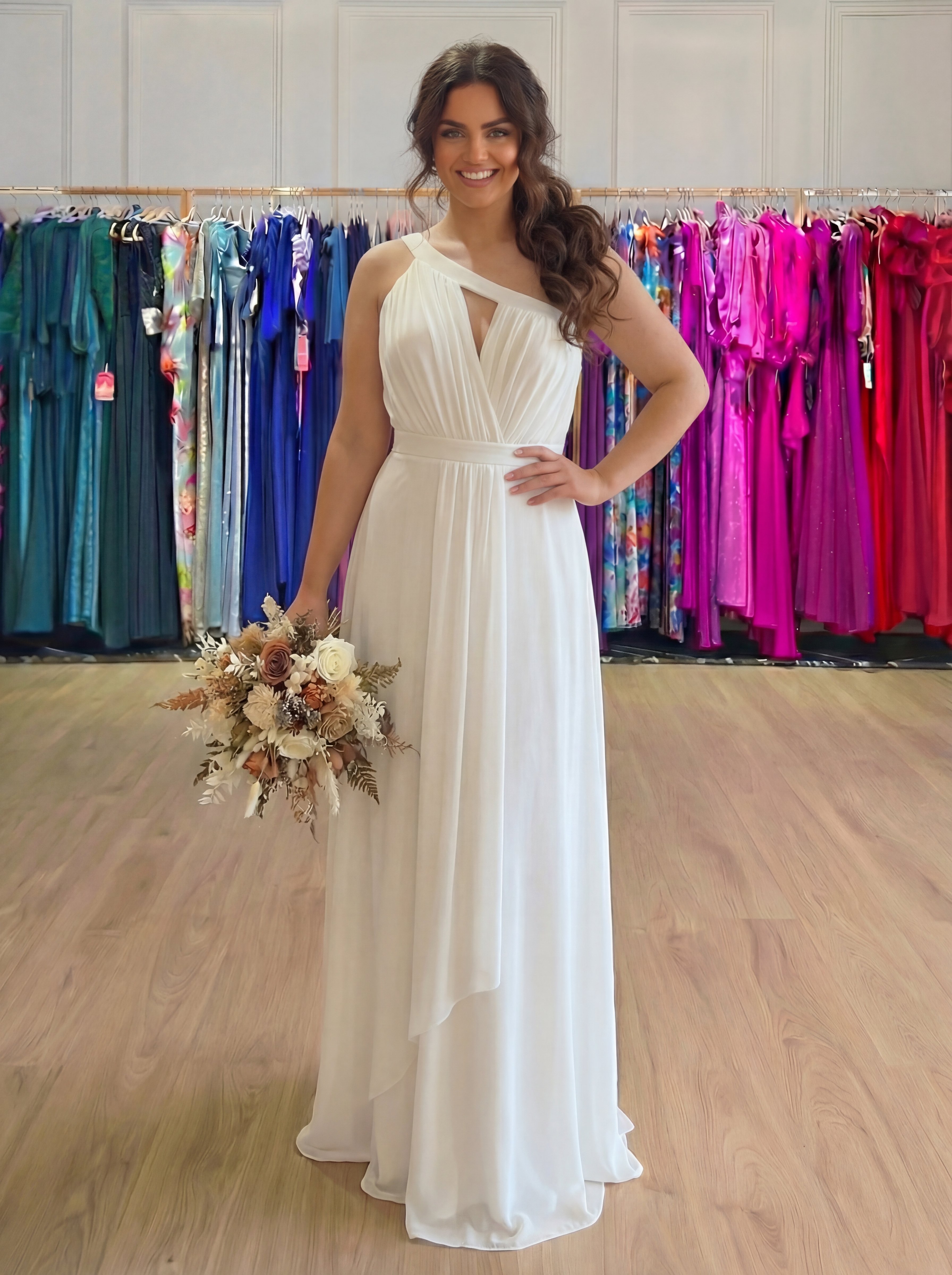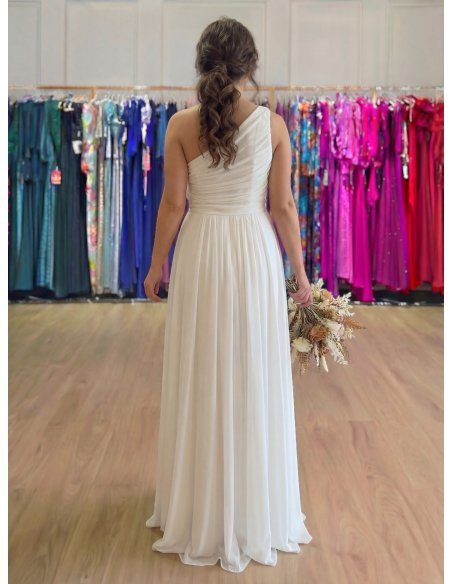 Vestido de novia de tul elástico y diseño helénico, con escote asimétrico. Abertura en el pecho, cazuelas incorporadas y cinturilla.